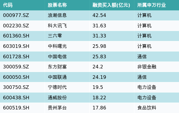 上周两市共有3120只个股有融资资金买入,共有34只个股买入金额超10亿元,其中浪潮信息、科大讯飞、三六零排名前三,买入金额分别42.54亿元、31.63亿元、31.33亿元。融资买入额前10个股详情见下表: