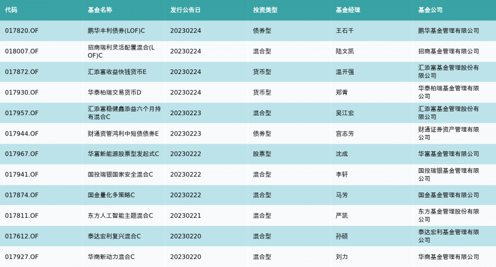 上周有12只新基金发行,分别为:鹏华丰利债券(LOF)C、招商瑞利灵活配置混合(LOF)C、汇添富收益快钱货币E、华泰柏瑞交易货币D、汇添富稳健鑫添益六个月持有混合C、财通资管鸿利中短债债券E、华富新能源股票型发起式C、国投瑞银国家安全混合C、国金量化多策略C、东方人工智能主题混合C、泰达宏利复兴混合C、华商新动力混合C,详情见下表: