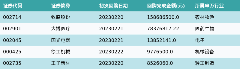 上周共有15条开始执行回购公告,其中执行金额最多的5家公司为:牧原股份、大博医疗、国光电器、徐工机械以及王子新材。