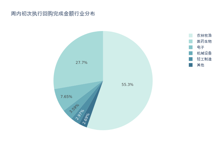 按照初次执行金额所在不同行业分布,金额最高的3个行业分别为:农林牧渔、医药生物、电子,详情见下图: