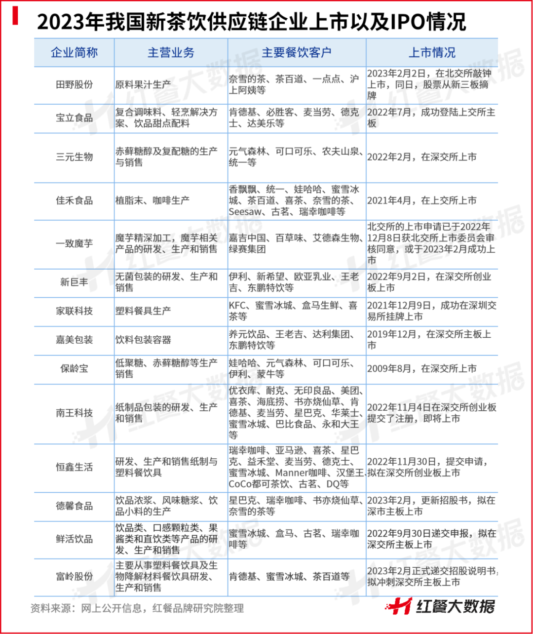 总的来说,虽然这些隐忧会对供应链企业造成一定的压力,但同时也会给他们带来不断进步、不断发展的动力,譬如近年来越来越多的茶饮供应链企业纷纷登陆资本市场便是一大进步。