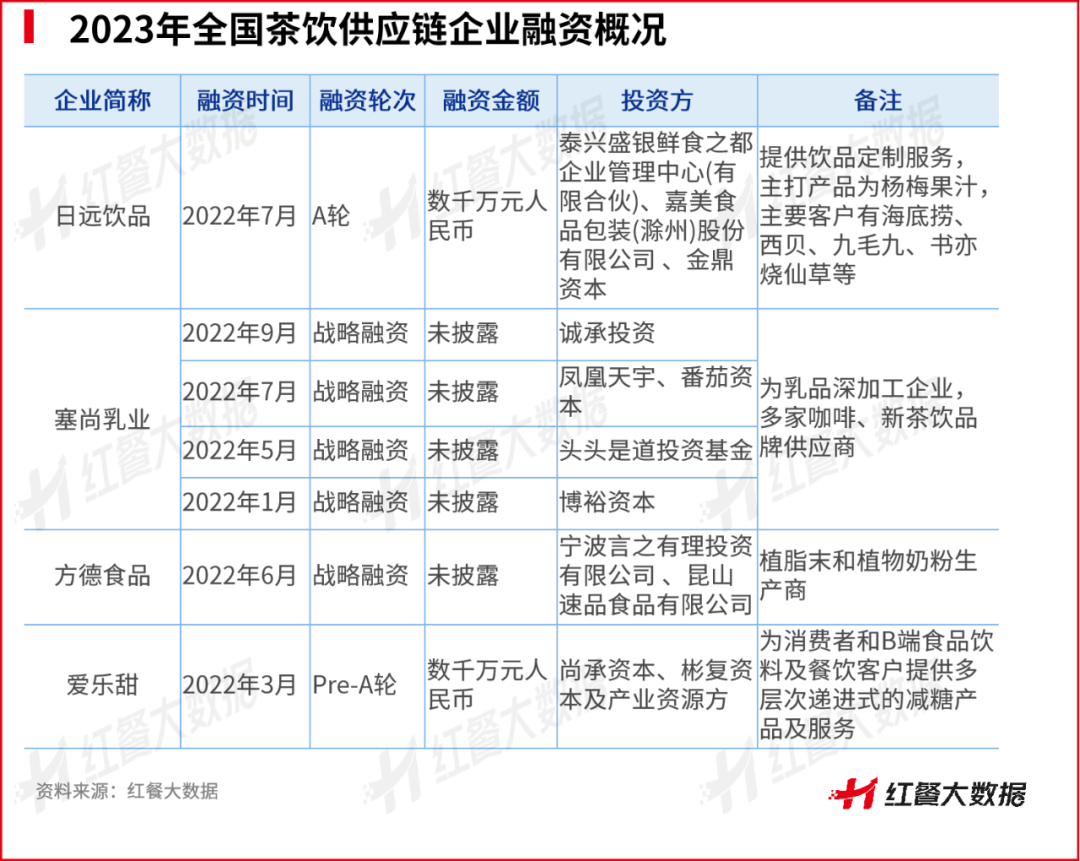 不过,现在的情况已经有所转变。2022年,也有多家新茶饮供应商获得融资。比如专注饮品定制服务的日远饮品,生产植脂末和植物奶粉的方德食品,提供减糖产品的爱乐甜等,其中融资次数最多的为乳品深加工企业塞尚乳业,一年之内竟连获4轮融资。