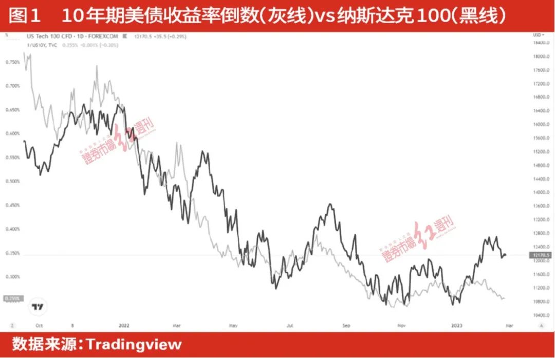 问题在于,股市是否完全计价了加息预期?美债市场已经重新计价了加息预期的变化,10年期收益率刷新3个月新高接近4%,国债波动率指数MOVE显著升高。下图中灰线代表的是收益率的倒数(收益率越高,灰线数值越低),黑线代表纳斯达克100指数。