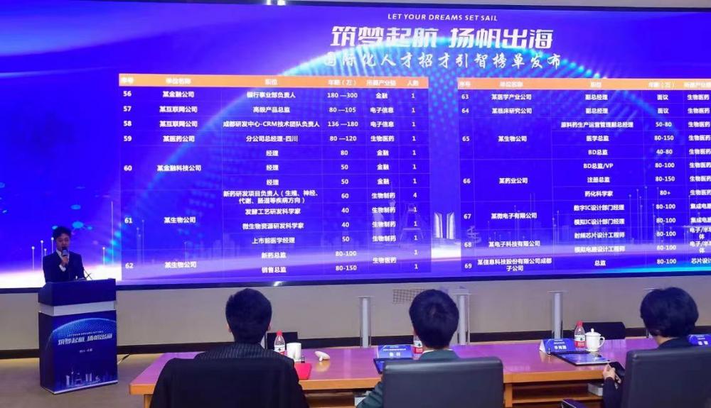 以本次出海引智活动为契机,成都高新区还面向全球发布了“国际化人才招才引智榜单”,覆盖集成电路、人工智能、金融等重点产业链方向,涉及70余家企业100个岗位需求。其中一家金融公司为银行事业部负责人开出的年薪区间在180万元-300万元。