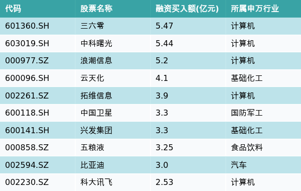 2月27日,两市共有3120只个股有融资资金买入,其中三六零、中科曙光、浪潮信息排名前三,买入金额分别5.47亿元、5.44亿元、5.2亿元。融资买入额前10个股详情见下表:
