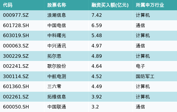 2月28日,两市共有3120只个股有融资资金买入,其中浪潮信息、中国电信、中科曙光排名前三,买入金额分别7.42亿元、6.59亿元、5.48亿元。融资买入额前10个股详情见下表: