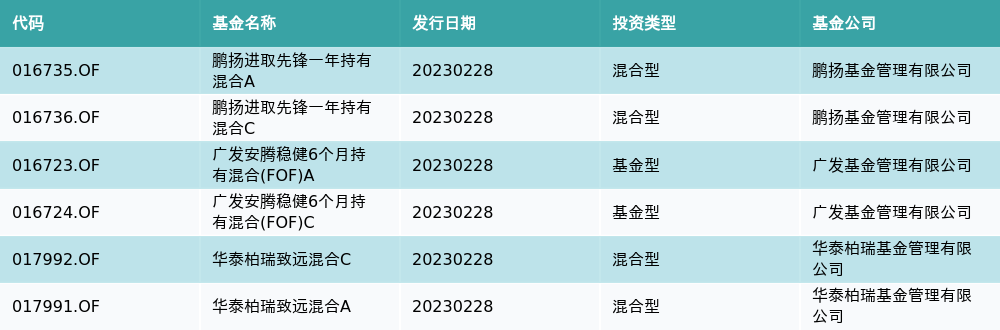 2月28日有6只新基金发行,分别为:鹏扬进取先锋一年持有混合A、鹏扬进取先锋一年持有混合C、广发安腾稳健6个月持有混合(FOF)A、广发安腾稳健6个月持有混合(FOF)C、华泰柏瑞致远混合C、华泰柏瑞致远混合A,详情见下表: