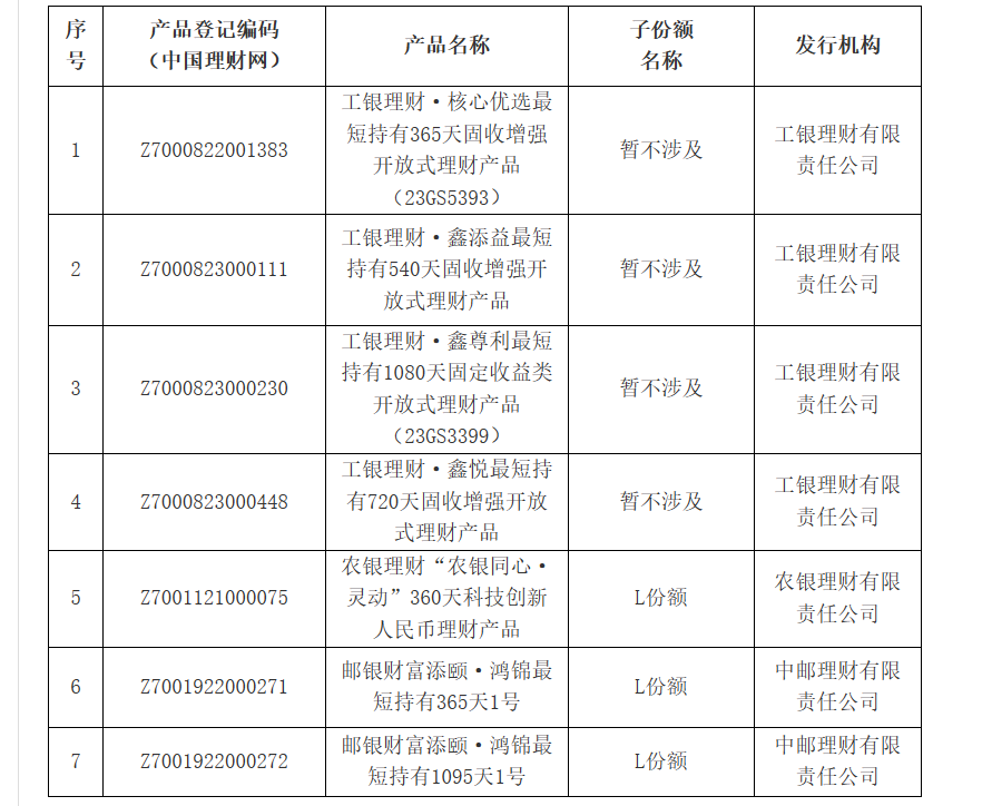 首批入选7款产品由工银理财、农银理财、中邮理财3家机构发售。其中,5只为新发产品,2只为存续产品,1只为混合类产品,6只为固定收益类产品。