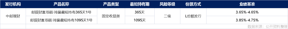 公开信息显示,七只产品中有六只采用区间型业绩比较基准形式,其中业绩比较基准上沿前三名分别为:工银理财·鑫尊利最短持有1080天固定收益类开放式理财产品、工银理财·鑫悦最短持有720天固收增强开放式理财产品以及邮银财富添颐·鸿锦最短持有1095天1号(L份额)。业绩比较基准报价跨度最大的产品为邮银财富添颐·鸿锦最短持有365天1号。