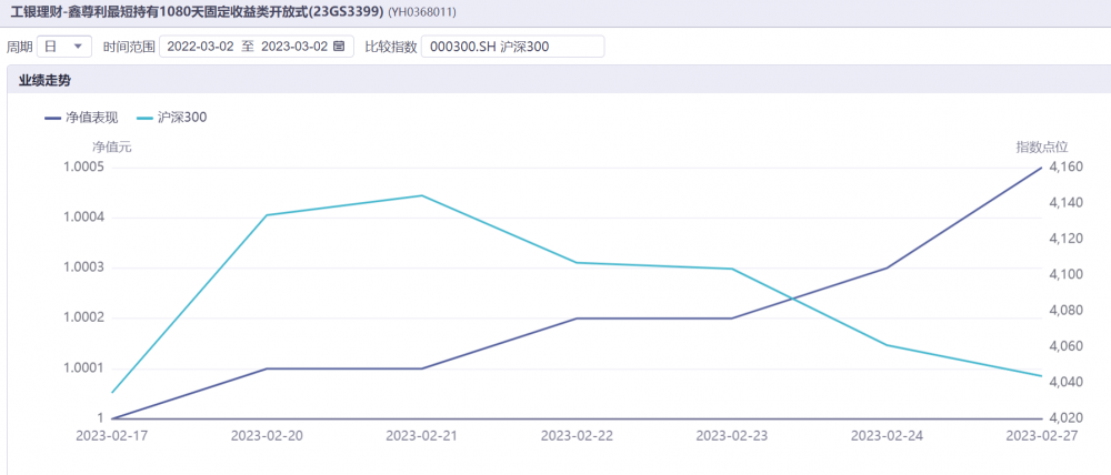 从风险等级看,四只产品中,仅有一只为R3(中等风险产品),该产品业绩基准以利率债0-50%、信用债30-100%、股票0-20%、衍生品0-5%为例测算。2月17日运行以来,截至2月27日工银理财·鑫尊利最短持有1080天固定收益类开放式净值表现为1.0005。