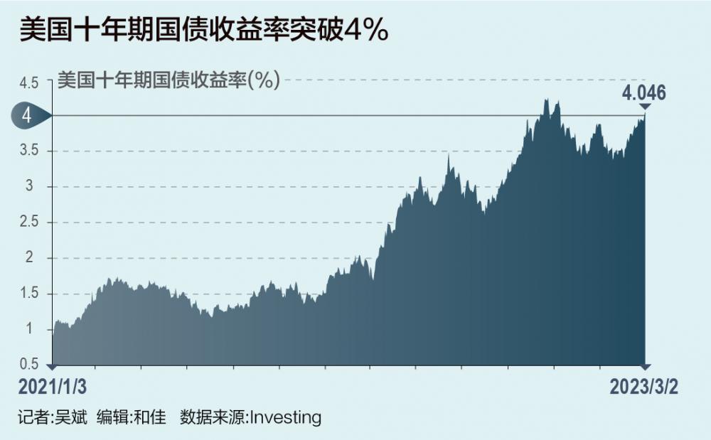 3月1日,投资者对粘性通胀和更高峰值利率的担忧情绪挥之不去,有着“全球资产定价之锚”之称的10年期美债收益率一度突破4%关口,重新回到了去年四季度触及的十余年高位附近。3月2日,10年期美债收益率继续走高,一度升至4.046%。
