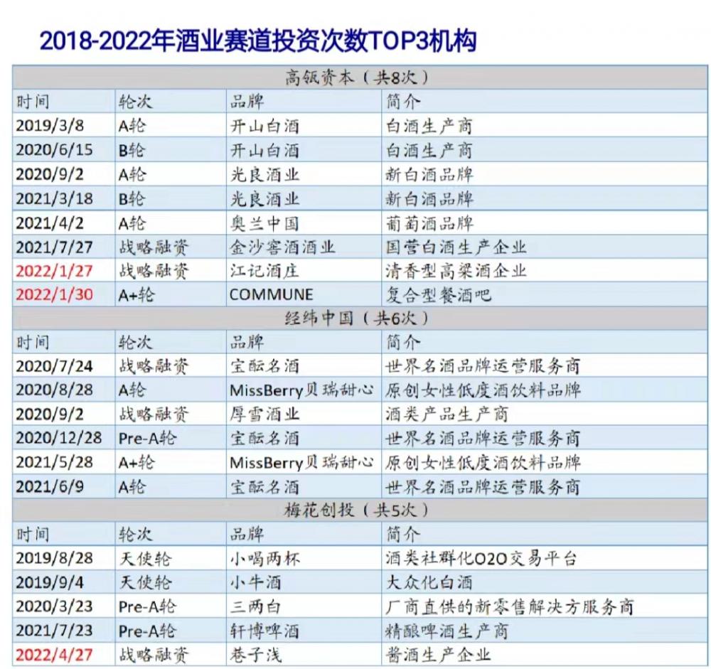 除了日初资本刚进入白酒行业,闻宏伟说,从2018年至2022年,酒业赛道投资次数top3的资本分别是梅花创投、高瓴资本和经纬中国。