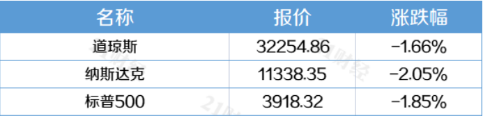 截至收盘,道指跌1.66%报32254.86点;标普500指数跌1.85%报3918.32点,创两周最大跌幅;纳指跌2.05%报11338.35点。