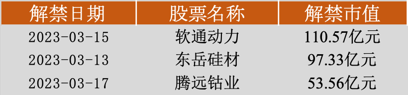其中,解禁市值居前三位的是:软通动力(110.57亿元)、东岳硅材(97.33亿元)、腾远钴业(53.56亿元)。