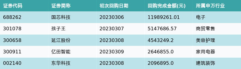 上周共有8条开始执行回购公告,其中执行金额最多的5家公司为:国芯科技、孩子王、延江股份、亿田智能以及东华科技。