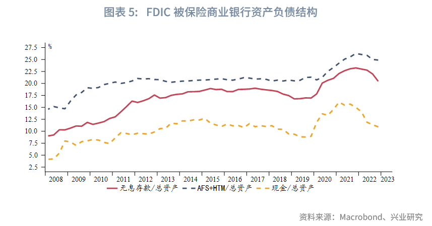 根据FDIC被保险商业银行和存款机构的资产负债数据,硅谷银行的严重资产负债错配并不具有普遍性,更多是其特有的业务模式所致。根据FDIC统计,商业银行和存款机构的可供出售(AFS)和持有至到期(HTM)资产占比不超过30%,无息存款比例18%~22%,远低于硅谷银行的比例,同时现金占比在10%左右,高于硅谷银行。