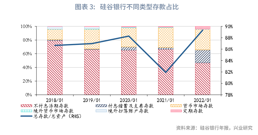 硅谷银行的存款有70%左右来自于不计息活期存款(noninterest-bearing demand deposit)。出现这一情况的主要原因是,硅谷银行的服务对象多为美国的科技创新公司以及以科技创新为投资对象的风投基金或私募基金。上述企业为了确保能够有充足的资金开展并购或研发投资,因此往往在银行中留存了大量流动性较好的存款。
