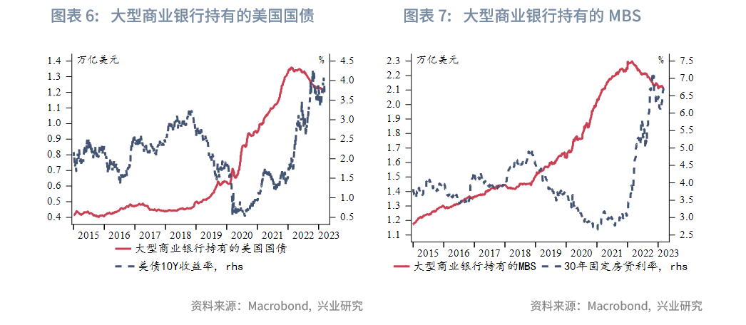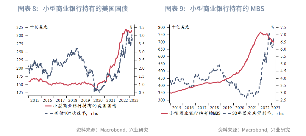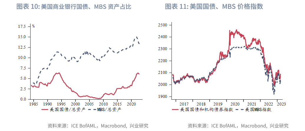 根据美联储统计口径,商业银行在2021至2022年期间对美国国债和MBS(价格)“越跌越买”,小型商业银行买入比大型商业银行更为积极。美联储激进加息给银行带来了普遍的未实现损失。不过BTFP的创设使得未实现损失的潜在风险迎刃而解。根据FDIC统计,美国商业银行持有的对利率敏感的美国国债和MBS分别占总资产约5%和13%,资产占比远不及硅谷银行那般激进。此外应注意到,资产减值最严重的时期是在2022年第四季度而非当下,这也从侧面反映了硅谷银行倒闭不能完全归咎于资产端的未实现亏损,更多是负债端成本抬升和存款流失导致。