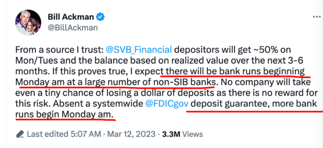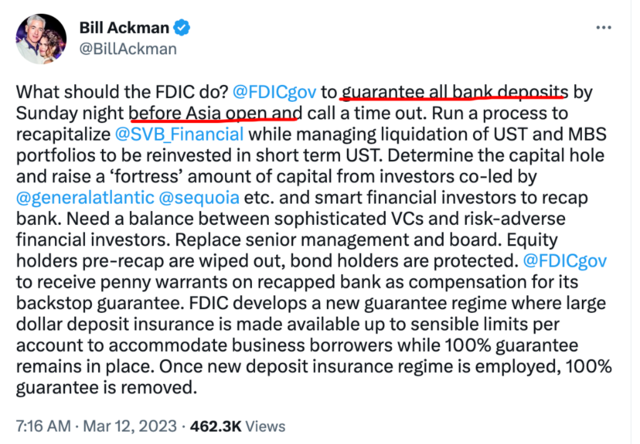 Ackman在新的一条推文中写的更清楚,美国联邦存款保险(FDIC)应该在美国时间周日晚上(即北京时间周一早上)亚洲市场开盘前,为所有银行存款提供担保,并按下暂停键。
