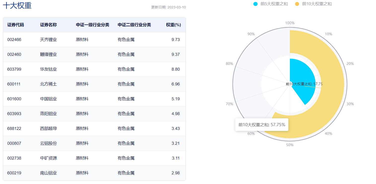 中证指数公司官网显示,截至2023年3月10日,工业有色指数(H11059)前十大权重股分别为天齐锂业、赣锋锂业、华友钴业、北方稀土、中国铝业、洛阳钼业、西部超导、云铝股份、中矿资源、南山铝业,权重合计占比57.75%。