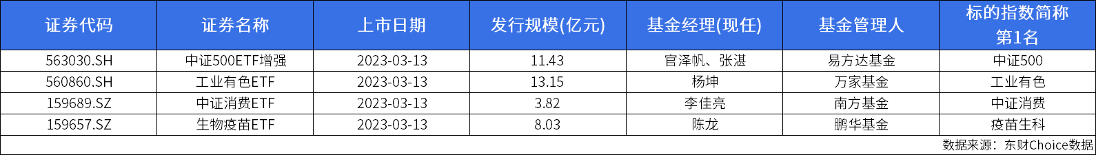 2023年3月13日,4只新ETF基金正式上市,分别为易方达基金中证500ETF增强(563030)、万家基金工业有色ETF(560860)、南方基金中证消费ETF(159689)、鹏华基金生物疫苗ETF(159657),发行规模分别为11.43亿元、13.15亿元、3.82亿元、8.03亿元。