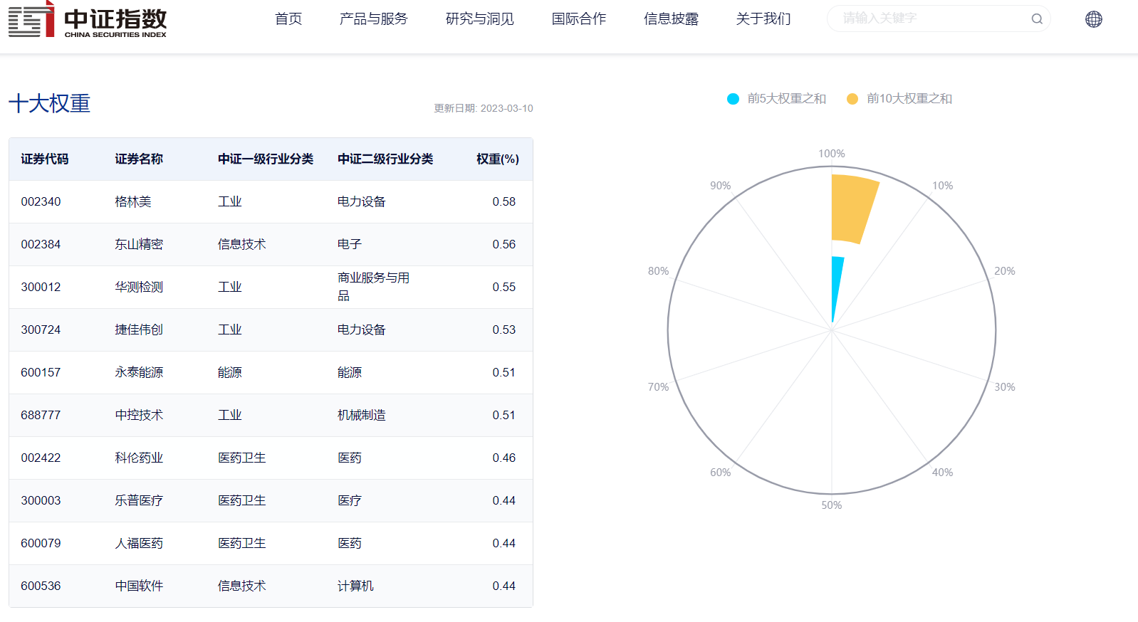 中证指数公司官网显示,截至2023年3月10日,中证500指数(000905)前十大权重股分别为格林美、东山精密、华测检测、捷佳伟创、永泰能源、中控技术、科伦药业、乐普医疗、人福医药、中国软件,权重合计占比5.01%。