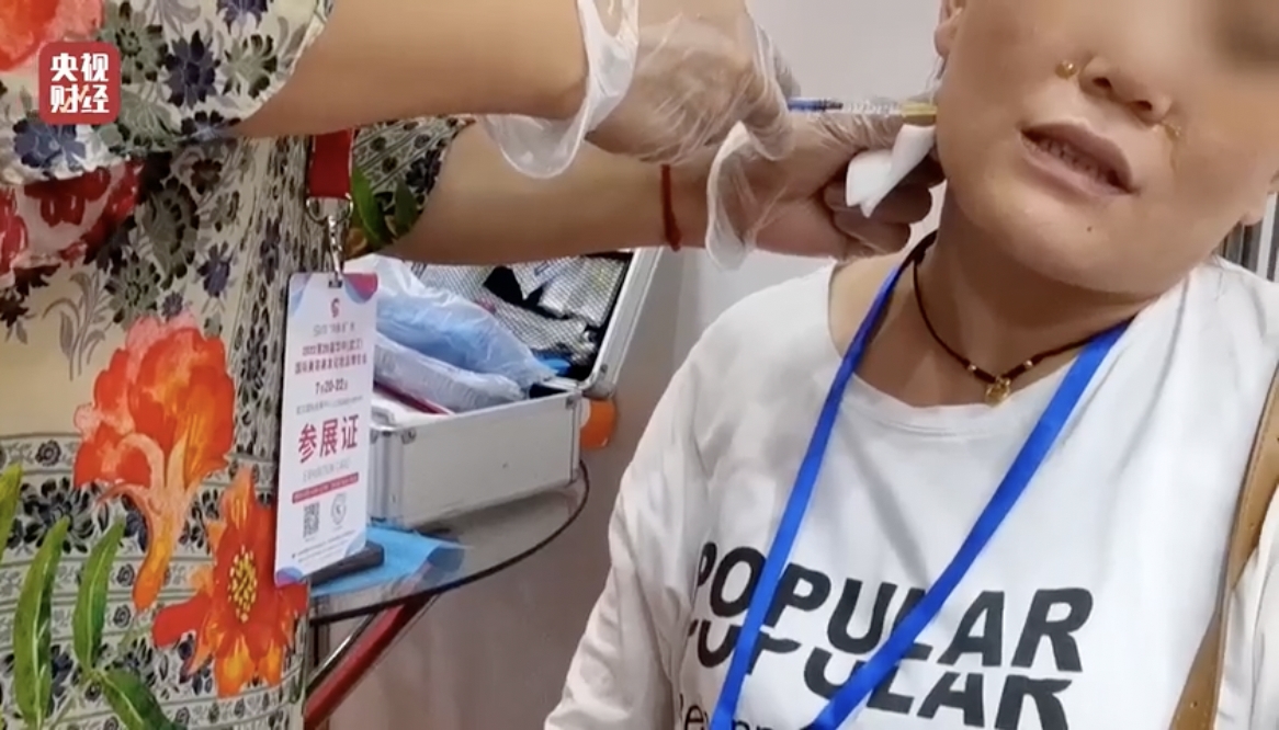 就这样,一款只被批准用于表层涂抹的化妆品被打进了消费者的面部。记者进一步调查发现,在这些展会上,有些面部美容针剂注射产品甚至连化妆品备案都没有。