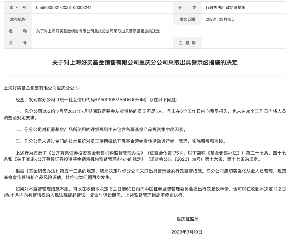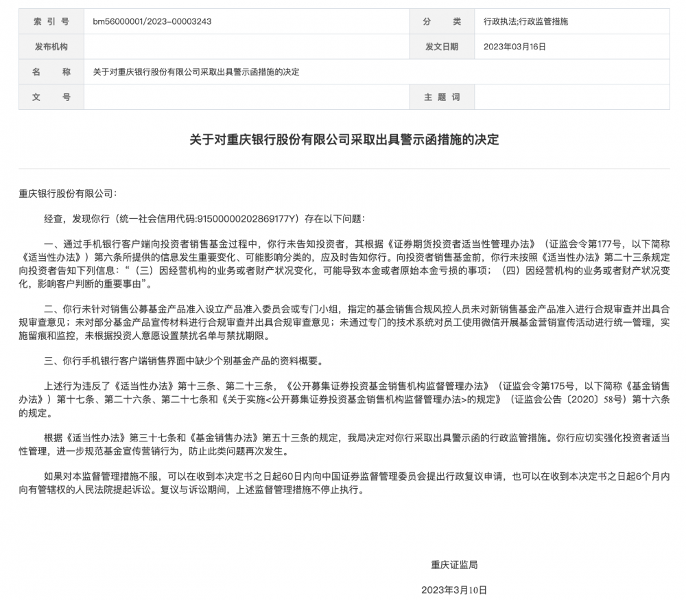 重庆证监局3月16日披露三则与基金销售违规相关的行政监管措施决定,重庆银行、好买基金重庆分公司、重庆农商行分别被出具警示函。而重庆银行、好买基金重庆分公司此番被罚,均与互联网渠道销售基金或营销宣传存在违规行为有关。