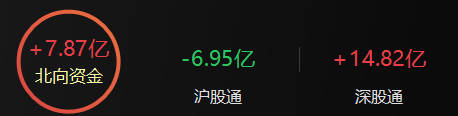 北向资金全天净买入7.87亿元,其中沪股通净卖出6.95亿元,深股通净买入14.82亿元。