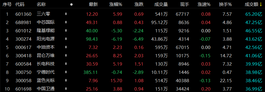 个股方面,三六零成交额居首,达65.20亿元。中芯国际、隆基绿能、阳光电源、中油资本、昆仑万维成交额也在40亿元以上,分别为47.25亿元、46.55亿元、43.62、42.56、41.06亿元。