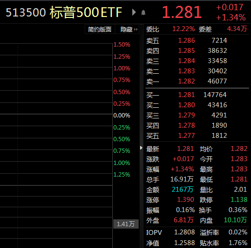 今日(3月17日),标普500ETF(513500)高开,开盘后10分钟,该ETF涨超1%,盘中溢价,成交额破2100万元。