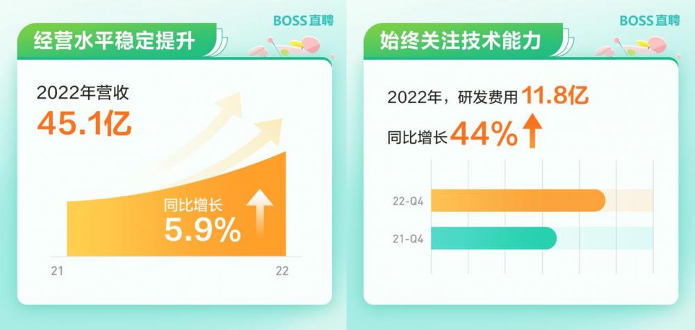 3月20日盘前,BOSS直聘(NASDAQ:BZ,HK:2076)发布了2022年第四季度及全年财报。2022年,公司营收达到45.11亿元,同比上涨5.9%。全年研发费用达11.83亿元,同比增长43.9%。