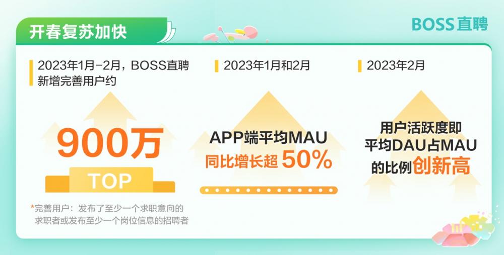 2023年春节后,市场需求回暖,叠加传统“春招”旺季的利好因素,BOSS直聘迎来了强劲增长。2023年1月至2月,BOSS直聘新增完善用户约900万人。期间用户活跃度,即平均DAU占MAU的比例创下新高。2月平台月活跃企业数也超过了历史高点。