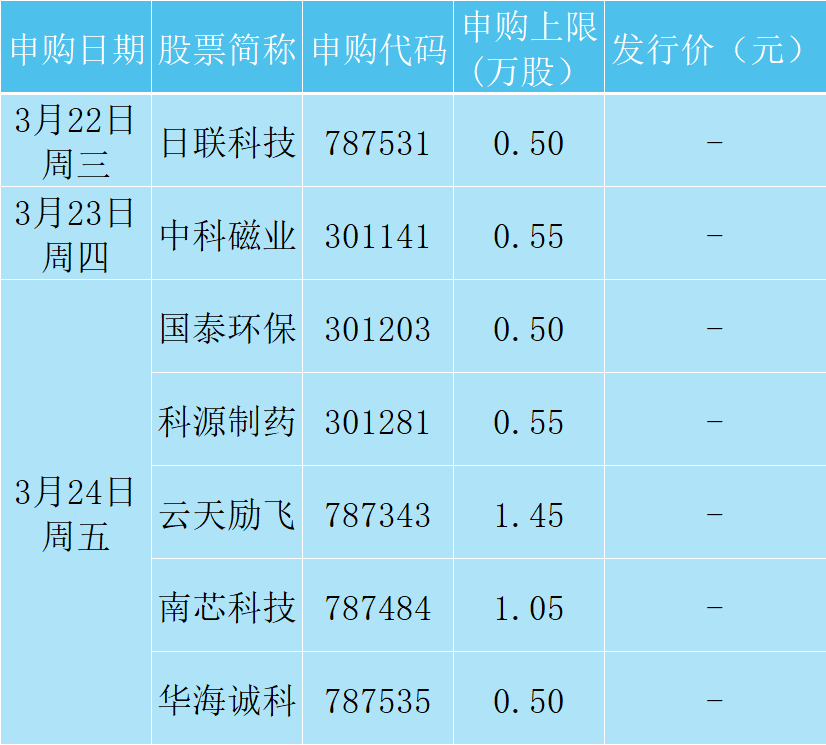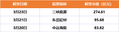 Wind数据显示,除将上市的新股外,本周(3月20日-3月26日)将有59只股票面临限售股解禁,合计解禁量为80.05亿股。按3月17日收盘价计算,合计解禁市值为718.56亿元。其中,解禁市值居前三位的是:三峡能源(274.61亿元)、东岳硅材(95.68亿元)、中远海能(83.82亿元)。