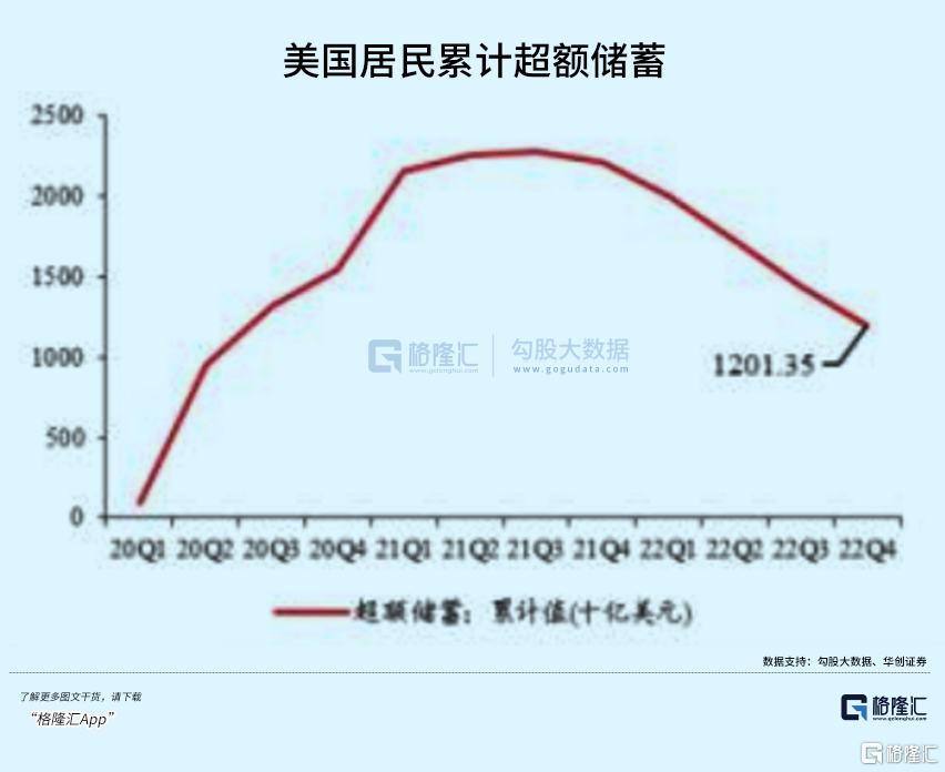 从2020年Q4至2022年Q4,超额储蓄已经减少1.1万亿美元,剩下1.2万亿美元。超额储蓄持续消耗,并没有流向股市与楼市,更多是流向消费领域,支撑了美国经济的韧性增长。
