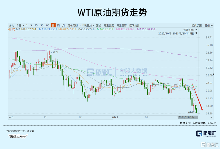 相比股市下跌,原油市场遭遇了更猛烈的抛售。WTI原油主力期货从3月7日的80美元/桶,一路狂泻至今,现价只有64.5美元/桶,累计跌幅高达20%。如此顺溜的下跌,显然受到了欧美银行业危机的波及,开始交易欧美经济会因此进入衰退节奏之中。