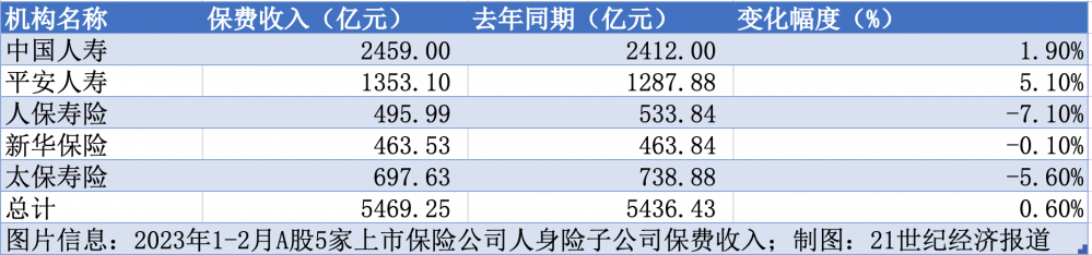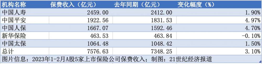 近日,A股5大上市保险公司2月保费悉数发布。据21世纪经济报道记者统计,2023年1-2月,上述5家保险公司累计实现保费收入7576.63亿元,较去年同期增加3.10%。