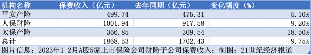 2023年1-2月,A股五家上市保险公司财险子公司保费收入较去年同期均有增加。“老三家”( 人保财险、平安产险、太保产险)共揽保费1868.53亿元,同比增加9.75%。