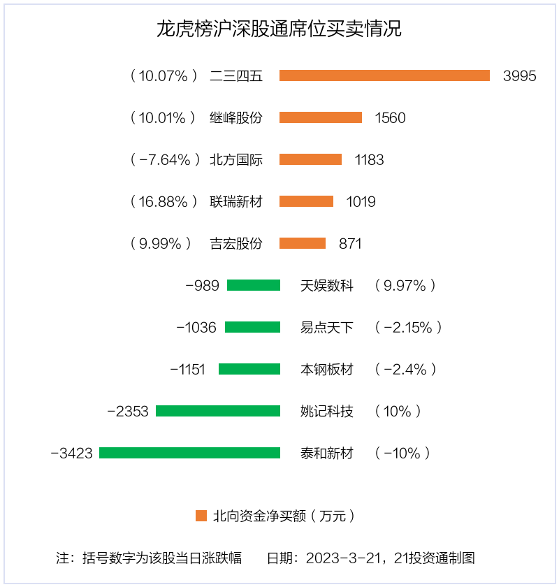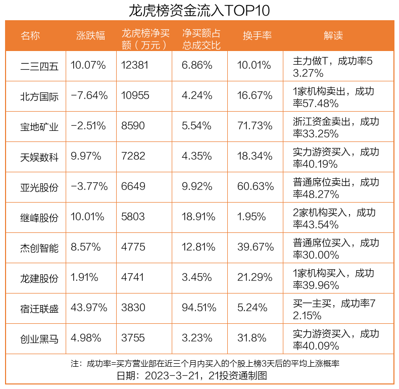 3月21日,上证指数上涨0.64%,深证成指上涨1.6%,创业板指上涨1.98%。盘后龙虎榜数据显示,共有43只个股因当日异动登上龙虎榜,资金净流入最多的是二三四五(002195.SZ),达1.24亿元。