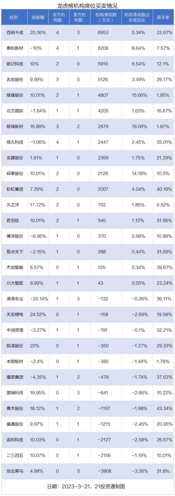 3月21日,29只个股龙虎榜出现了机构的身影,机构合计净买入3.42亿元。具体来看,机构净买入17股,净卖出12股。