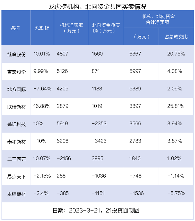 值得注意的是,机构和北向资金共同净买入了继峰股份、北方国际、联瑞新材、吉宏股份等4股;共同净卖出了本钢板材;在二三四五,易点天下,姚记科技,泰和新材上出现分歧,机构净卖出二三四五2155.62万元,北向资金净买入3995.3万元;机构净买入易点天下287.61万元,北向资金净卖出1035.69万元;机构净买入姚记科技5918.59万元,北向资金净卖出2353万元;机构净买入泰和新材6206.45万元,北向资金净卖出3423.47万元。