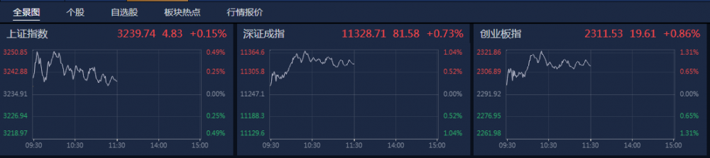 A股早盘收盘,南财金融终端显示,沪指涨0.15%,深成指涨0.73%,创业板指涨0.86%。