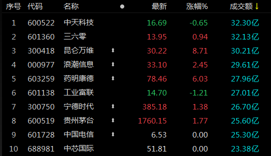 两市超3400只个股上涨。沪深两市早盘成交额5108亿,较上个交易日缩量1940亿。其中,中天科技成交额最多,成交额为32.30亿元,三六零、昆仑万维成交额也在30亿以上。
