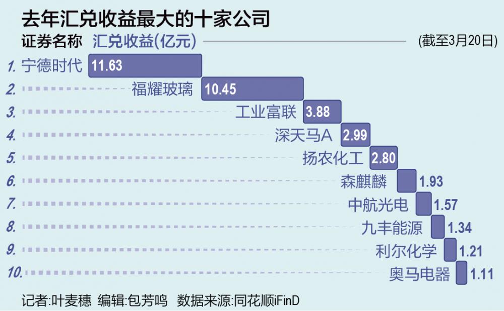 根据同花顺统计,已披露的年报中汇兑收益超过1亿元的公司,除了上述两家之外,还有工业富联、深天马等十家公司。