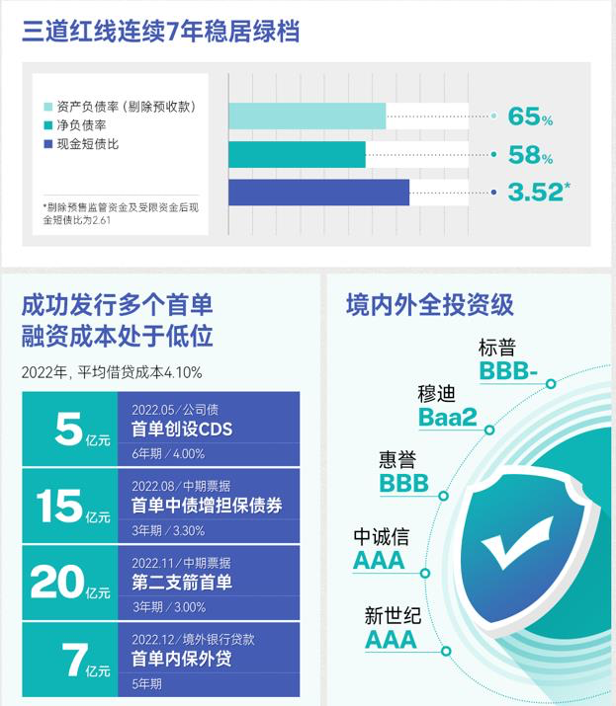 截至2022年12月31日,其资产负债率(剔除预收款)为64.8%,净负债率为58.1%,现金短债比达到3.52倍,“三道红线”连续7年绿档;平均贷款年限为6.67年,平均借贷成本仅为4.10%,融资成本持续低位运行。