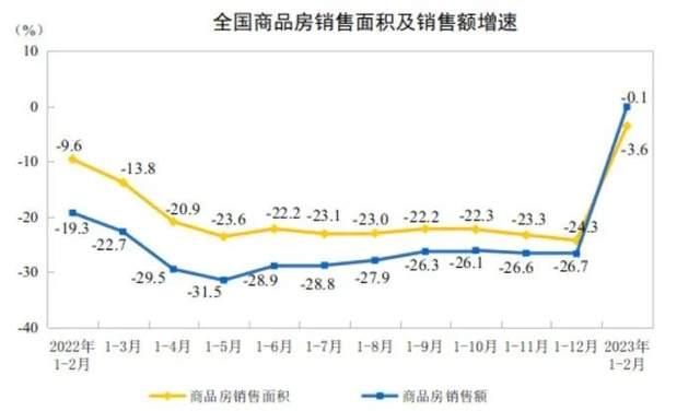 同期,全国商品房销售面积15133万平方米,同比下降3.6%,较去年1-12月下降24.3%,增速回升20.7个百分点;全国商品房销售额15449亿元,同比下降0.1%,其中住宅销售额增速回正为3.5%。