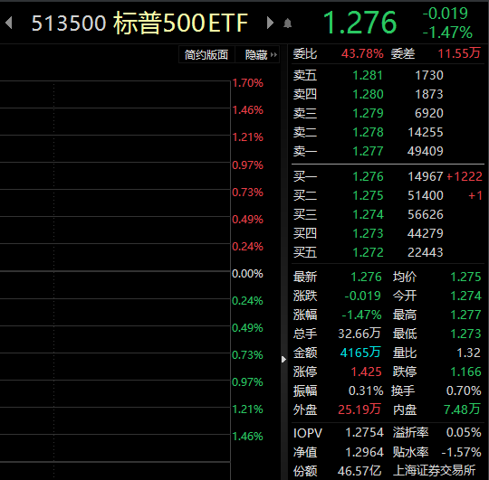 截至发稿,标普500ETF(513500)跌1.47%,成交额超4100万元,盘中交易溢价,交投活跃。