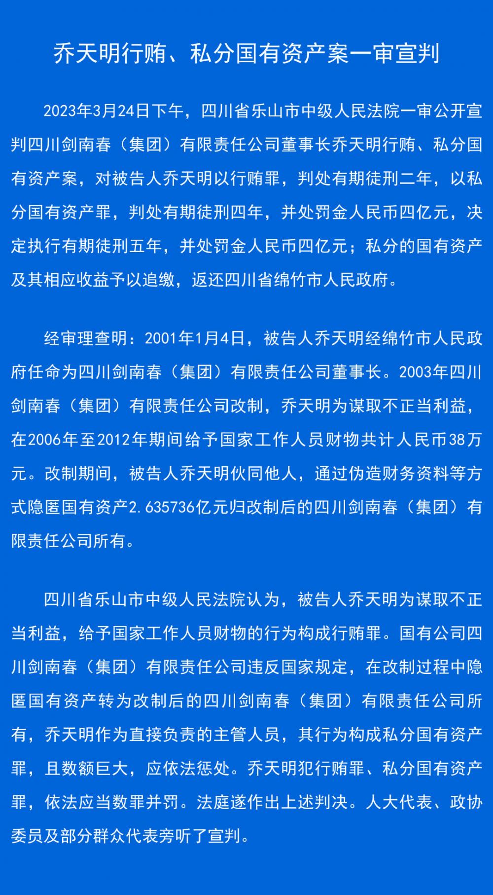 3月24日下午,乐山市中级人民法院公开宣判四川剑南春集团有限责任公司(下称剑南春集团)原董事长乔天明行贿、私分国有资产案,对被告人乔天明以行贿罪判处有期徒刑二年、以私分国有资产罪判处有期徒刑四年,并处罚金4亿元,决定执行有期徒刑五年,并处罚金4亿元;私分国有资产及其相应收益予以追缴,返还四川省绵竹市政府。