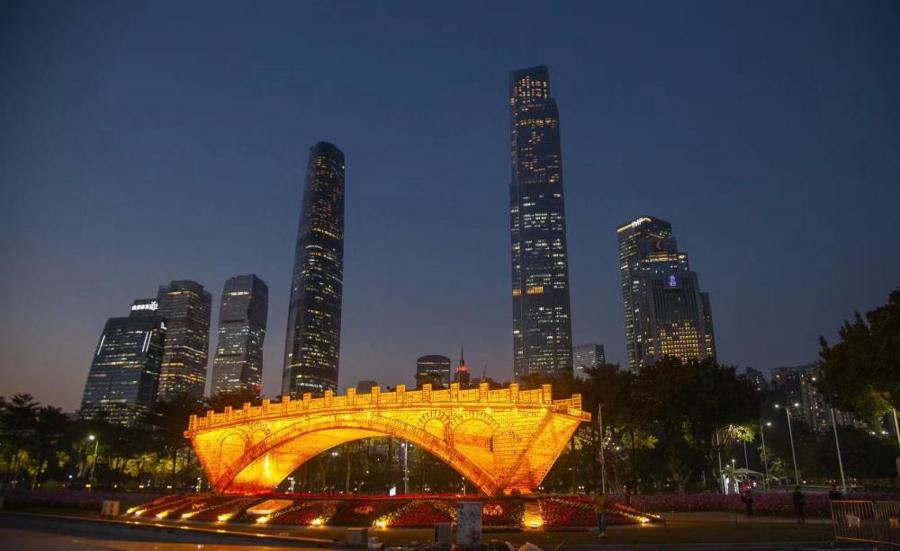 曾亮相多场外交活动的大型图腾雕塑《丝路金桥》自2021年起在广州海心沙公园展出,该作品以“一带一路”为创作语境,由近两万块嵌有“一带一路”范围内53个国家、94个城市国花或市花的“丝路金砖”(金色水晶)拼装而成。