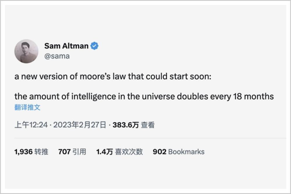 伴随ChatGPT爆火,“ChatGPT之父”、OpenAI 首席执行官山姆·阿尔特曼(Sam Altman)也在今年2月表示:“新版摩尔定律很快就要来了,宇宙中的AI智能每18个月要翻一倍。”